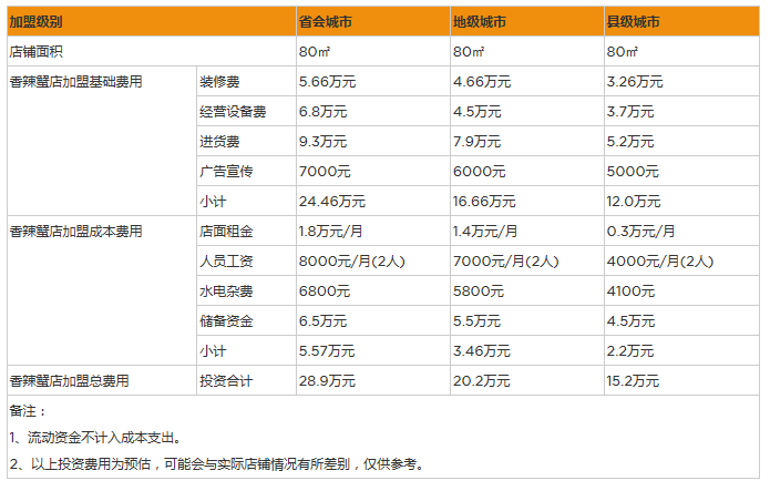 综上所述,开一家80平米的香辣蟹店加盟店大概需要15万左右的资金,如果大家对加盟一家重庆老香辣蟹需要多少资金还有什么疑惑的话可以拨打下方热线进行咨询,我们竭诚为你服务!